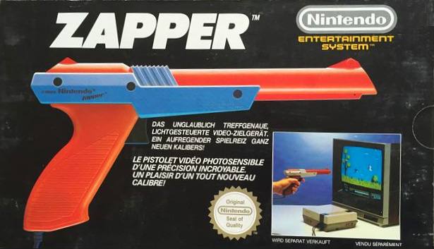 Zeitglich mit den NES wurde in den USA im Oktober 1985 auch gleich das wohl bekannteste Zubehör für Nintendos 8-Bit-Konsole veröffentlicht: Der NES Zapper! Die Plastik-Lightgun wurde zum Launch in den USA im sogenannten „Deluxe“-Bundle der Konsole beigelegt und auch dem wenige Wochen später veröffentlichten und äußerst populären „Action-Set“ lag die Plastikpistole bei. Insbesondere letzteres sorgte im Zusammenspiel mit dem enthaltenen 2-in-1-Kombimodul inklusive Super Mario Bros. und Duck Hunt für eine weite Verbreitung des – im Übrigen auch separat erhältlichen – Zubehörs. In Europa erschien der Zapper zum NES-Launch im September 1986, wenngleich das Bundle mit Super Mario Bros. und Duck Hunt hier nur eine untergeordnete Rolle spielte.