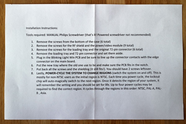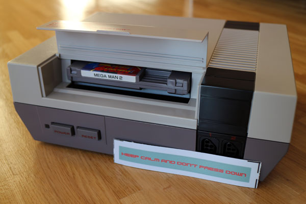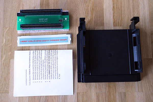 Der Einbau des BLW gestaltet sich relativ einfach. Ihr benötigt nur einen normalen Kreuz-Schraubenzieher. Nach dem Öffnen des NES-Gehäuse löst ihr die Schrauben des Schutzblechs sowie des originalen Modul-Slots, nehmt diesen ab, zieht den alten Pin-Connector von der Platine ab und setzt die neuen BLW-Bauteile in gleicher Weise wieder ein. Wer möchte, kann anschließend noch einen dem BWL beigefügten Aufkleber auf der Fläche vor dem Modul-Slot anbringen: „Keep calm and don’t press down“. Ein Hinweis darauf, dass ein Herunterdrücken der Module nicht länger nötig ist.