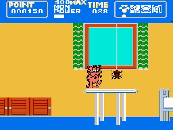 Kommen wir nun zum Gameplay – sofern man es so bezeichnen will, denn Garfield steuert sich unglaublich hakelig. Dazu ist die Kollisionsabfrage für die Katz (haha...), oftmals weiß man gar nicht, auf welchen Objekten man stehen kann und auf welchen nicht, teils kann man auch einfach durch im Weg stehende Tische hindurchhüpfen. Attacken mit dem gefürchteten Kick des Todes offenbaren sich als eine Qual. Will man einen Gegner attackieren, so muss der Angriff ganz genau getimt werden, ansonsten verliert der fette Kater Energie – was mehr als oft der Fall sein wird. Und werdet ihr mal von einem Gegner getroffen, hängt dieser nicht selten in Garfield fest und leert ihm innerhalb 1-2 Sekunden die komplette Energieleiste. Und da eine Katze in diesem Spiel nicht neun, sondern nur ein einziges Leben hat, ist der Verlust der Lebensenergie gleichbedeutend mit „Game Over“. Wer die ganzen 9 Welten zu Gesicht bekommen will, muss also eine Unmenge an Geduld mitbringen. Wer dann jedoch hofft, immerhin einiges an Abwechslung geboten zu bekommen, der liegt leider ebenfalls mächtig falsch. Außer den Hintergrundgrafiken gibt es praktisch nichts, was man nicht auch schon in anderen Levels gesehen hat.