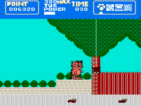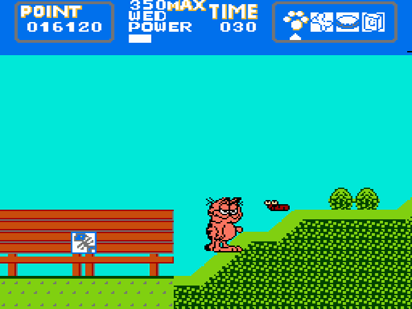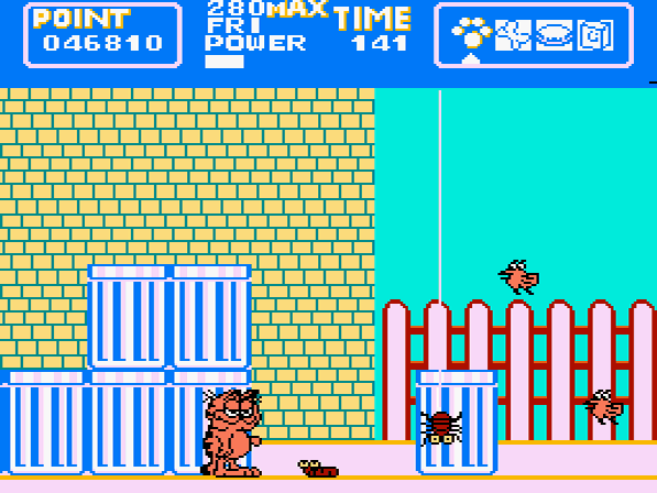Glücklicherweise weiß sich Garfield auch zur Wehr zu setzen. Mit einem herzhaften Tritt, bei dem Garfield den Fuß geschätzte 3.7 cm vom Boden hebt, kann er Gegner ins Jenseits befördern. Allerdings kann er diesen nur anwenden, wenn Garfield sich aufrecht fortbewegt. Auf allen Vieren hingegen kann er keine Gegner attackieren, dafür jedoch unter gegnerischen Attacken durchhuschen. Neben seinem gefürchteten Kick kann Garfield auch von aufgesammelten Hamburgern, Knochen oder Käsestücken Gebrauch machen, in dem er diese gegen das feindliche Gesindel wirft. Auch weitere mehr oder weniger nützliche Items gibt es zu finden. Milch oder eine Tasse Kaffee erhöhen eure kümmerliche Energieleiste ein wenig, die Fischgräte hingegen macht genau das Gegenteil und entzieht euch Lebenssaft. Findet Garfield Stiefel, so kann er mit diesen für kurze Zeit wesentlich schneller laufen. In den Abschnitten steht der orange Kater des öfteren auch mal vor verschlossenen Türen. Hier gilt es jeweils einen Schlüssel aufzuspüren, um weiter zu kommen. Und zu guter Letzt darf natürlich auch die Lasagne – Garfields absolute Lieblingsspeise – nicht fehlen. Diese sorgt für einige Sekunden Unverwundbarkeit. Zu finden sind diese Items jeweils in weißen Boxen, welche unsichtbar und gut versteckt auf eine Berührung von Garfield warten, um zum Vorschein zu kommen.