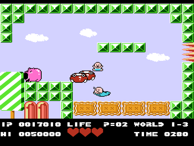 Mit einem Umfang von 21 Levels fordert Bio Miracle Bokutte Upa vom Spieler sicherlich einen langen Atem sowie eine ausgiebige Gamingsession am Stück. Da der Titel im Verlauf des Abenteuers aber wie erwähnt stets mit neuen Elementen aufzutrumpfen weiß, wurde die Spieldauer von Konami genau richtig gewählt. Solltet ihr die Gelegenheit haben, zwischen den Versionen für das Famicom Disk System und für das Famicom wählen zu können, sei letztere empfohlen. Neben den nur leichten, kosmetischen Änderungen wie einem geänderten Titelbildschirm enthält diese nämlich zusätzlich einen Easy Mode, der Upa bei Spielbeginn mit mehr Leben ausstattet und ihn mehr Gegentreffer als im Normal Mode einstecken lässt. Des Weiteren wurde für die fünf Jahre jüngere Famicom-Version der Soundtrack überarbeitet und klingt in dieser Fassung einfach sehr viel voller als im Original, ähnlich wie dies auch bei der Konvertierung eines Castlevania 2 der Fall war. Wie eingangs bereits erwähnt wurde, erschien auf der Wii Virtual Console die Famicom Disk System Variante. Trotz der Vorzüge des Famicom-Moduls können wir euch aber auch den Download wärmstens ans Herz legen, denn Bio Miracle Bokutte Upa ist ein echter Geheimtipp unter den Famicom-Plattformern und zählt als Modulversion zu den eher teureren Spielen.