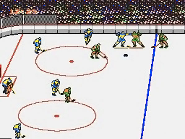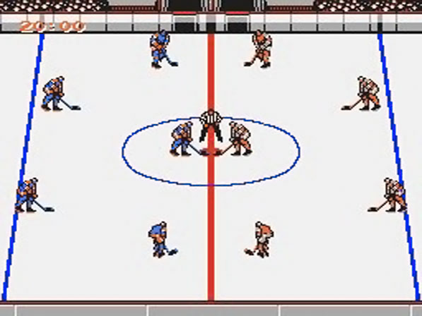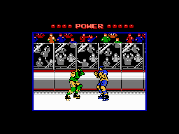Nachdem man sich gleich zu Beginn entschieden hat, dass man alleine spielen möchte, wird man automatisch zu einem simplen Auswahlmenü gelotst. Zunächst wird man gefragt, ob man ein Freundschaftsspiel (Exhibition) oder ein Turnier (Tournament) bestreiten möchte. Beim nächsten Punkt wählt man eine der drei Schwierigkeitsstufen aus (Junior, College und Pro) und wird darauf gleich zur Teamauswahl geschickt. Im Gegensatz zu "Ice Hockey" stehen euch nicht die Mannschaften der führenden Eishockey-Nationen zur Verfügung, sondern acht Top-Teams der NHL. Die Mannschaften unterscheiden sich (meines Wissens) nicht in ihren Stärken, womit man sich bei der Auswahl schlicht auf seine Lieblingsfarbe festlegen kann :) Wenn man das Turnier angewählt hat, wird auch gleich noch der gesamte Spielplan angezeigt. Man spielt im K.O.-Modus und hat inklusive Finale insgesamt drei Spiele zu bestreiten. Eine Niederlage bedeutet, dass man unweigerlich die Heimreise antreten muss. Nach diesen wenigen Schritten kann das eigentlich Spiel auch schon losgehen. Durch diese einfache und kurze Menüführung wird ziemlich rasch klar, dass es bei "Blades Of Steel" eindeutig um die Action geht und Taktikfans hier nichts zu suchen haben! Die Figuren lassen sich nach dem Bully sauber und präzise über das Eis steuern. Auf dem Feld weist euch der heftig blinkende Spieler darauf hin, dass er derjenige ist, der in diesem Moment euren Steuerbefehlen gehorcht, mittels einfachem Tastendruck lässt sich dies jedoch ändern und der Spieler, der sich am nächsten beim Puck befindet, wird aktiviert. Grundsätzlich geht es darum (wie bei Eishockey eben üblich), dem Widersacher die schwarze Scheibe abzunehmen und sie ins gegnerische Netz zu spedieren. Dafür bedient man sich zuweilen auch etwas unkonventioneller Methoden. Wenn man einen Gegner drei Mal in Folge gerammt hat, kommt es zu einer Schlägerei, wobei das Bild augenblicklich zu einer Grossaufnahme der beiden Streithähne wechselt und es auch gleich losgehen kann! Man kann dabei den Gegner mit Schlägen zudecken oder dessen Fäuste blocken. Die fünf roten Punkte oberhalb der Spieler zeigen die "Lebensenergie" an, wobei sich bei jedem eingesteckten Schlag ein Punkt in Luft auflöst. Sobald ein Spieler ohne Energie dasteht, wechselt das Bild wieder zur Spielfeldansicht, der Niedergeschlagene kassiert eine Zwei-Minuten-Strafe und der Gewinner behält die begehrte Scheibe.