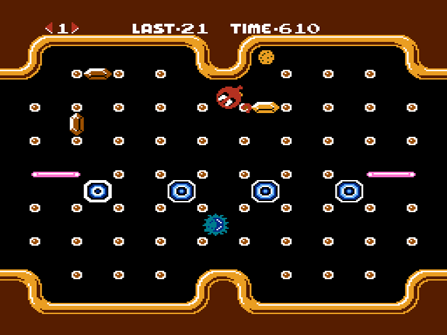 Um die Highscoreanzeige in die Höhe zu treiben - denn um nichts anderes geht es in Clu Clu Land - sollten die Levels so schnell wie möglich absolviert werden. Auch das Einsammeln gelegentlich aufpoppender Items dient demselben Zweck, wobei seltenere Goodies für ein großzügigeres Zeitlimit oder Extraversuche sorgen. Für besonders talentierte Mastendreher winken außerdem kurze Bonusrunden. Weniger erprobte Spieler hingegen werden das geringe Kontingent an Extraleben schnell aufbrauchen und erneut im ersten Level starten müssen, um es beim nächsten Mal besser zu machen. Ohne die nötige Reaktionsschnelligkeit kann es innerhalb einer Minute bereits Game Over heißen. Wer einen Mitspieler findet, darf übrigens auch zu zweit auf Punktejagd gehen: In diesem Fall gesellt sich zur roten Bubbles noch ein grüner Klon hinzu und man rast gleichzeitig durch die Labyrinthe. Ob man dabei eher kooperativ vorgeht oder einfach um den besseren Highscore wetteifert, bleibt einem ganz selbst überlassen. So oder so ist der Zweispielermodus - wie so oft bei früheren NES-Spielen - sicherlich das Highlight des Titels.