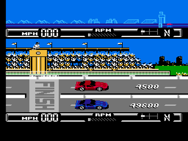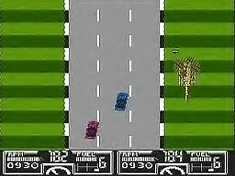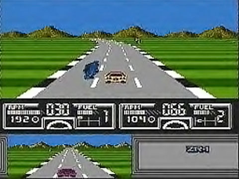 Das Rennen gestaltet sich in zwei Phasen, was für reichlich Abwechslung sorgen soll. Beim ersten Teil handelt es sich um ein sogenanntes Drag Race (Beschleunigungsrennen), wo es darum geht, den Gegner mittels perfekt koordiniertem Gasgeben und Schalten abzuhängen. Ihr habt richtig gelesen: Die Schaltvorgänge liegen in den Händen des Spielers, wobei die Schwierigkeit darin liegt, dass man für einen Schaltvorgang den Fuß vom Gas nehmen muss. Eben genau wie in der Wirklichkeit. Sobald man eine kurze Strecke im Drag Race abgespult hat, wird man nahtlos übergeleitet zum Straßenrennen. Wieso es von Vorteil ist, wenn man die Beschleunigungsorgie für sich entschieden hat, wird einem an dieser Stelle vor Augen geführt. Wie es sich bei einem Rennen zu zweit gehört, fährt man mit geteilten Bildschirm, wobei in diesem Titel der führende Spieler die gesamte obere Bildschirmhälfte in Besitz nehmen darf und der Zweitplatzierte in einen winzigen Bildschirmviertel in der unteren Hälfte gequetscht wird. Die Übersicht leidet darunter dermaßen stark, dass eine Aufholjagd zur Glückssache wird, zumal zahlreiche unbeteiligte Autos und Motorräder die freie Bahn versperren und zu unfreiwilligen Flügen verhelfen. Zusätzlich erschwert auch die Tatsache, dass das Benzin sehr rasch alle ist und man gezwungen wird, am Straßenrand liegende Benzinkanister aufzusammeln. Das Rennen führt über neun Strecken, die sich von ihrer Beschaffenheit und Optik nur geringfügig unterscheiden.