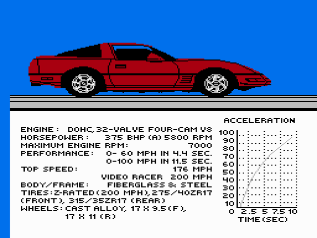Jedem, der sich nur ansatzweise für Sportautos interessiert, dürfte Corvette ZR-1 ein Begriff sein. Die Vorstellung, mit einem derartigen Superauto über die endlosen Highways der Vereinigen Staaten zu brettern, lässt sicherlich viele Herzen höher schlagen, was der Hersteller dieses Titels gnadenlos auszunutzen versuchte. So kann sich der Spieler also, nachdem er einen von acht verschiedenen Charakteren ausgewählt hat, ans Steuer einer roten Corvette setzen und gegen einen anderen dieser acht Charakteren in einem kompromisslosen Rennen sein Können unter Beweis stellen. Natürlich besitzen die unterschiedlichen Fahrer (wenn sie vom Computer gesteuert werden) auch verschiedene Eigenschaften, womit der Schwierigkeitsgrad variiert.