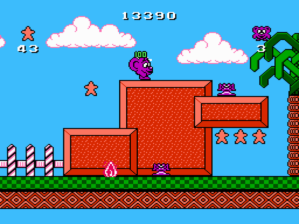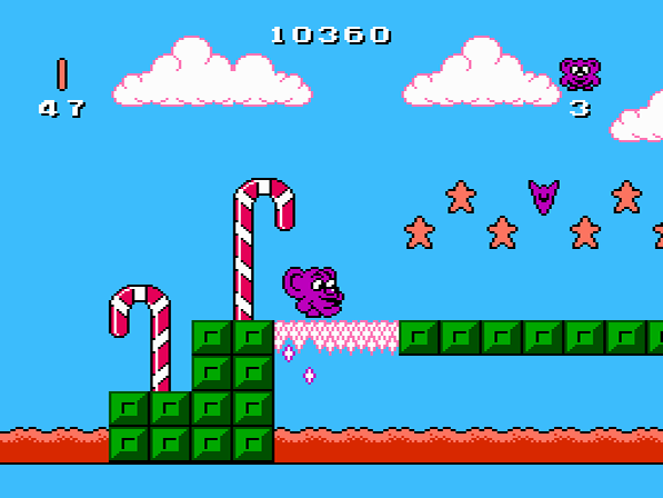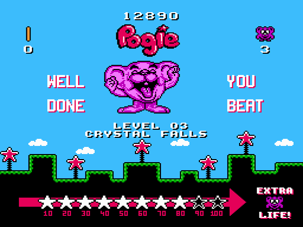 Weitere sammelbaren Items findet ihr in Clown-Boxen, welche euch Süßigkeiten preisgeben und euer Punktekonto in die Höhe treiben. Ebenso findet ihr in den Welten verteilte Schokoeier, welche euch nach einem Verlust der zu Beginn 5 Leben das Abenteuer an derselben Stelle fortsetzen lassen. Continues gibt es keine, habt ihr alle Leben verbraucht, so endet das Spiel vorzeitig. Die Einwohner von Candyland haben natürlich keine Freude an dem Süßigkeiten-Dieb und tun ihr Bestes, um es genau so weit kommen zu lassen. Ein Treffer reicht aus, um Pogie den Garaus zu machen. Ein lila Symbol, genannt Fizzola, erleichtert ihm das Leben etwas. Sammelt ihr das Objekt ein, so verwandelt sich Pogie in ein Werwolf-artiges Wesen und kann die wehrlose Gegnerschaft über den Haufen rennen.