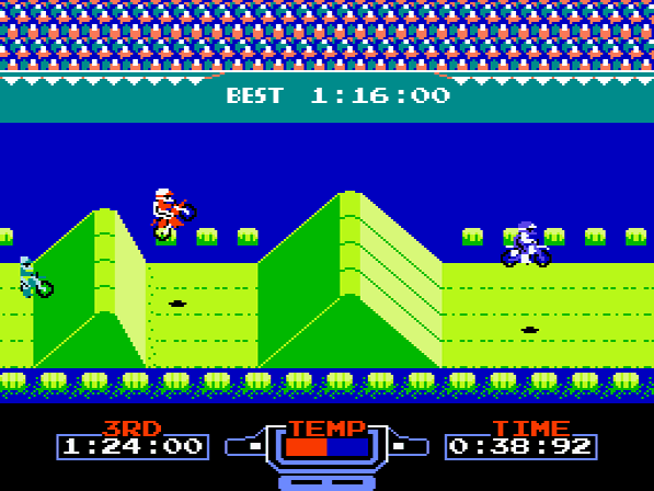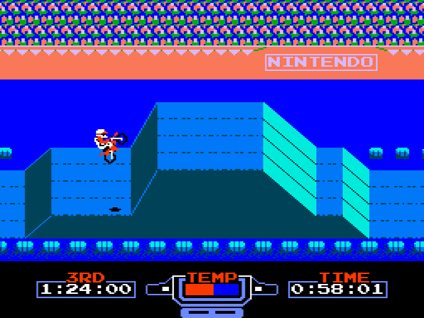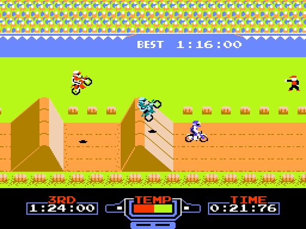 Vom Gameplay her gibt es eigentlich nichts zu bemängeln. Die Steuerung ist tadellos und das Spiel jederzeit fair. Die Anzahl Strecken ist mit fünf zwar nicht gerade gewaltig, aber dank des Streckeneditors ist das schnell wieder wettgemacht. Was allerdings schmerzlichst vermisst wird, ist eine Speichermöglichkeit, welche in der japanischen Version für das Famicom Disk System noch enthalten war. Eigene Strecken und Rekordzeiten sind somit nur solange verfügbar, bis das NES ausgeschaltet wird. Zudem w舐e ein 2-Spieler Modus ebenfalls wünschenswert gewesen. Trotz dieser Kritikpunkte bekommt ihr mit Excitebike aber einen absoluten Rennspielklassiker geboten, der für eine Runde zwischendurch immer perfekt geeignet ist.