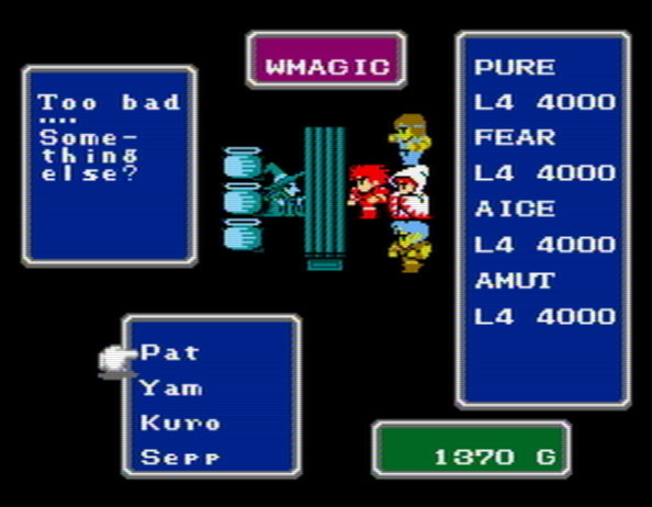 Neuartig an Final Fantasy gegenüber dem Genrekonkurrenten Dragon Quest war damals, dass man eine Heldentruppe steuern sowie deren Professionen individuell wählen konnte. Jede Heldenklasse hat unterschiedliche Fähigkeiten und beeinflusst den Spielererfolg massiv: Ein Rotmagier etwa kann sowohl Offensiv- als auch Defensivtechniken lernen, der Weissmagier ist in erster Linie defensiv unterwegs bzw. wird vorwiegend als Heiler eingesetzt, während der Schwarzmagier hauptsächlich Angriffe tätigt. Mit dem Schwarzgürtelträger und dem Krieger gibt es auch noch einige handfestere Burschen im Spiel zur Auswahl. Die Auswahl zu Beginn prägt das Geschehen ungemein und will gut überlegt sein, es empfiehlt sich eine ausgewogene Mischung zwischen Offensiv- und Defensivmagiern sowie hemdsärmeligen Kämpfernaturen zusammenzustellen. An der korrekten Auswahl der Startkonstellationen scheiden sich bis heute die Geister bzw. dieses lädt auch zu entsprechenden Challenges ein. Ein Spiel zu beginnen mit vier Weissmagiern ist aber vermutlich nicht sehr effektiv...