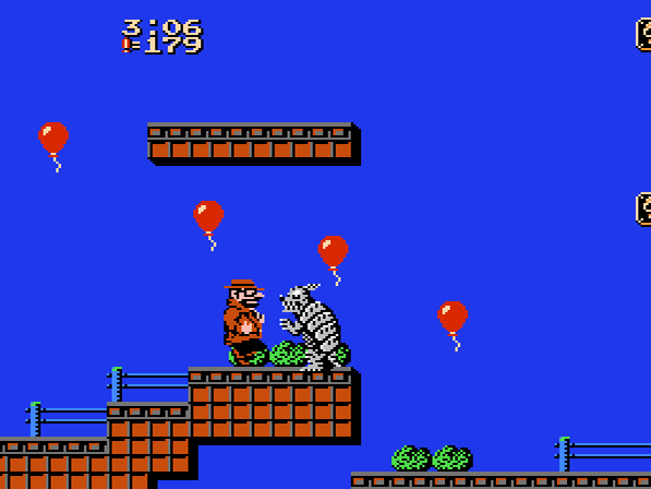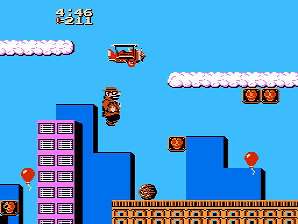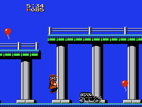 Auf seiner Diamant-Hatz ist der besorgte Vater jedoch auf eure Unterstützung angewiesen. Diese bietet ihr ihm in Form des NES Zappers. Mit der Lightgun ballert ihr allerdings nicht nur auf feindliche Objekte, sondern steuert damit auch R. L. Stevenson. Dieser läuft nämlich automatisch von links nach rechts durch die scrollenden Welten. Ein gezielter Schuss animiert den Detektiv zu einem Sprung, mit weiteren Treffern könnt ihr ihn sodann noch weiter in die Luft emporsteigen lassen. Damit überwindet ihr nicht nur tiefe Abgründe und erklimmt höhergelegene Plattformen, sondern weicht mit gut getimten Schüssen auch geschickt gefährlichen Hindernissen aus.