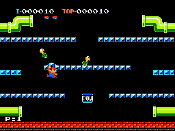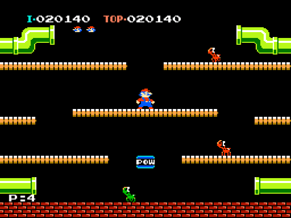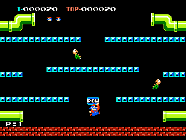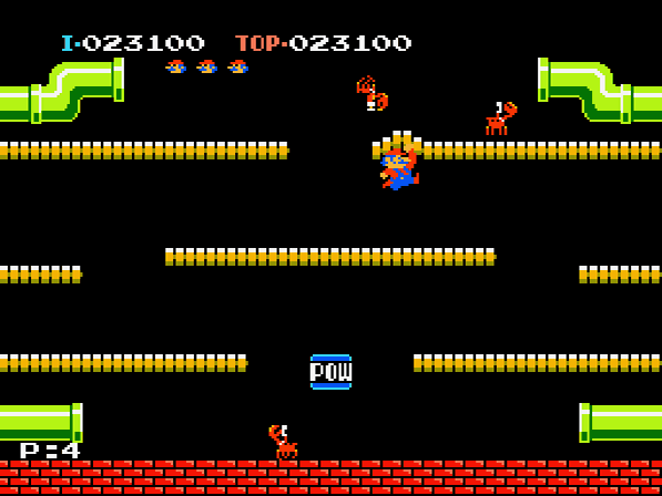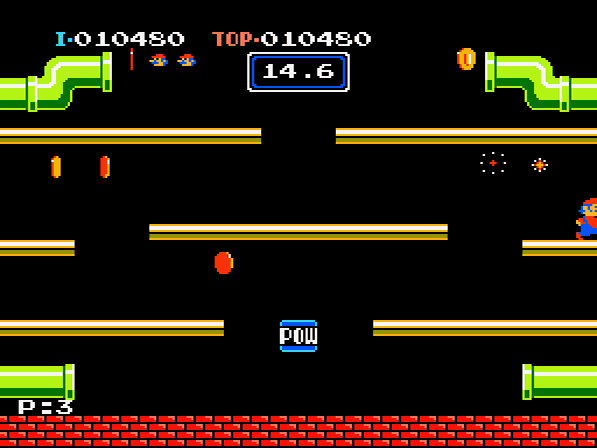 Für unsere Helden endet nämlich jeder Treffer tödlich – Power Ups wie Superpilz, Feuerblume oder Powerstern waren zu Zeiten von Mario Bros. noch Zukunftsmusik! Man startet mit drei Leben und das Spiel geht theoretisch endlos weiter bis man all jene in den Sand gesetzt hat, da sich nach elf Phasen in bester Arcademanier die Levels nur noch wiederholen – bis dahin wird es aber immer schwieriger, sich den mehrenden Gegnern zur Wehr zu setzen und vor allem, ihnen auszuweichen! Gut also, dass die Röhren für jedes besiegte Ungeheuer eine Münze ausspucken, die euren High Score in die Höhe treiben und ab einer gewissen Punktzahl auch für Extraleben sorgen werden! Ab höheren Phasen werden euch zudem verschiedenfarbige Feuerbälle einheizen und besonders coole Typen namens Slipice werden versuchen, ganze Plattformen zu vereisen, so dass die Klempner auf diesen stets ins Schleudern geraten werden – unter Umständen direkt in die nächste Schildkröte. Sollten einmal zu viele Widersacher auf dem Bildschirm umherkrabbeln, schafft der Powerblock für Abhilfe – bis zu drei Mal kann er eingesetzt werden und legt alle Gegner vorübergehend aufs Kreuz. Fegt man diese nun schnell genug hintereinander von der Bühne, so lassen sich noch mehr Punkte für Combos ergattern. Man sollte mit diesem Item allerdings sparsam umgehen, da man ihn sich in so mancher Situation herbeiwünschen wird, es jedoch ein paar Phasen dauert, bis der nächste Powerblock erscheint.