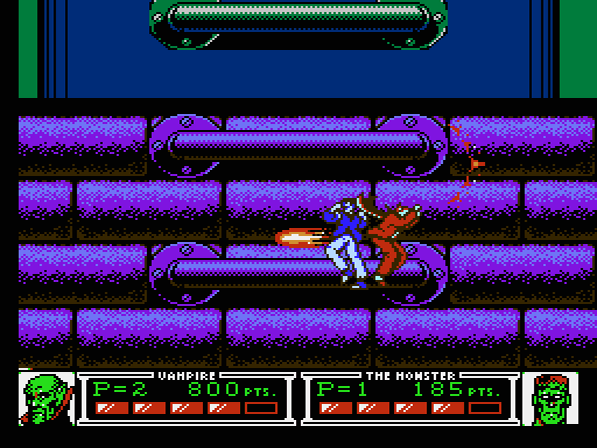Jedenfalls startet sodann das Abenteuer, in das man sich entweder allein oder zu zweit stürzen kann. Großartig Gedanken machen muss man sich über die Charakterauswahl jedoch nicht, da sich Vampir und Monster in all ihren (beschränkten) Fähigkeiten gleichen. Beide laufen gleich schnell, springen gleich hoch (und wenn es sein muss, auch ein zweites Mal in der Luft per Doppelsprung), können sich ducken und lassen als Angriff die Fäuste fliegen. Dies ist für das simple und auf Action ausgerichtete Gameplay allerdings allemal ausreichend. So wird man stets von allen Seiten von feindlichen Monsterhorden angegriffen, die man in der Regel mit einem oder zwei Fausthieben außer Gefecht setzt, um sich dann weiter Richtung Bossversteck zu bewegen. Das Heldenduo scheint dabei nicht nur bei besagtem Hexenmeister unbeliebt zu sein, auch zahlreiche andere Kreaturen aus dem MiMP-Reich haben es auf die beiden abgesehen. Wie bereits erwähnt, geben sich nicht nur klassische Vertreter der Horrorfiktion wie Goblins, Hexen und Dämonen die Ehre, sondern auch diverse Kreaturen aus Mythologie (Minotaurus) und Urzeit (T-Rex) sind sich für eine Tracht Prügel nicht zu schade.