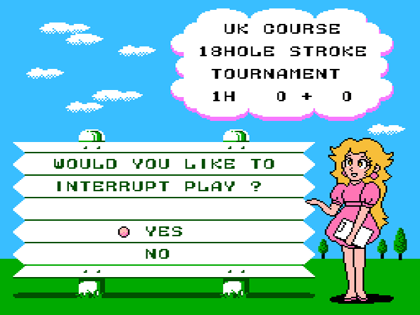 Mit NES Open Tournament Golf brachte Nintendo 1991 bereits das zweite eigens entwickelte Golfspiel auf den Markt. Nachdem man im Vorgänger mit dem schnörkellosen wie passenden Titel „Golf“ noch rätseln durfte, ob dort tatsächlich Mario den Golfschläger schwingt, ließ Nintendo in NES Open Tournament Golf keine Zweifel offen. Mario und Luigi (letzterer für den optionalen zweiten Spieler reserviert) werden von den Prinzessinnen Peach und Daisy bei ihren Aktivitäten angefeuert, und selbst Marios ehemaliger Erzfeind Donkey Kong gibt sich als Kassenwart des örtlichen Golfclubs die Ehre. Sonderlich aufdringliches Mario-Flair versprüht der Titel allerdings nicht. Das Geschehen spielt so etwa nicht im Pilzkönigreich, sondern auf Kursen rund um den uns wohl vertrauten Globus, und irrwitzige Items und Spielmodi wie aus späteren Titeln der Mario-Sportspiele sucht man vergeblich. Dies ist aber nicht weiter schlimm, da es sich bei NES Open Tournament Golf um eine hochwertige und sympathische Simulation handelt, die auch ohne solchen Schnickschnack zu begeistern weiß. Doch der Reihe nach.