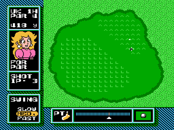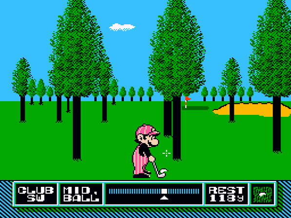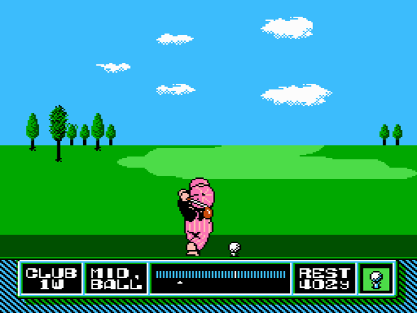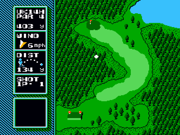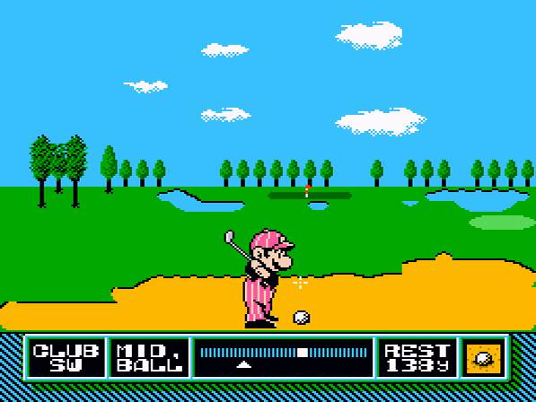 Egal in welchem Modus man sich befindet, so bleibt das eigentliche Gameplay hiervon unberührt. Die bereits im Vorgänger „Golf“ implementierte Schlagleiste kehrt in NES Open Tournament Golf zurück und hat sich bis heute als echter Genrestandard etabliert: Bei Abschlägen läuft nach dem ersten Druck auf den A-Knopf ein Punkt auf der Leiste nach links, bis man mit einem zweiten Drücken die Schlagkraft festgelegt, woraufhin der Punkt wieder nach rechts läuft, wo mit einem letzten Knopfdruck so genau wie möglich eine Markierung getroffen werden sollte, was die Genauigkeit des Schlags beeinflusst. Hört sich zunächst kompliziert an, hat man das Timing aber erst einmal raus, schlägt man die Bälle mit gewünschter Härte ohne Ausschlag nach links oder rechts aufs Grün. So zumindest die Theorie. Weitere Elemente wie die Wahl des richtigen Schlägers (nicht jeder Untergrund ist für jeden Schläger gleich gut geeignet), die korrekte Berücksichtigung des Windes und die Platzierung eines Spins auf dem Ball sorgen für Spieltiefe und Anspruch. Anders als in neueren Golfspielen gibt es jedoch keine Anzeige, wie weit der Ball voraussichtlich fliegen wird, was so mancher Anfänger schmerzlich vermissen wird. Ein mehr oder weniger gelungenes Risk-and-Reward-Element ist die Auswahl der Schlaggeschwindigkeit, bei der man zwischen drei Stufen wählen kann. Je höher die vorab ausgewählte Geschwindigkeit, desto schneller bewegt sich der Punkt auf der Schlagleiste und desto schwieriger wird es, punktgenaue Treffer zu landen. So drischt man den Ball auf der höchsten Stufe zwar vermeintlich weiter, allerdings besteht auch erhöhte Gefahr, dass man ihn mit voller Gewalt abseits des beabsichtigten Pfades prügelt. Andererseits können die gewonnenen Extra-Yards an Entfernung mitunter darüber entscheiden, ob man auf einem 5er-Loch einen „Eagle“ (zwei Schläge unter Par) überhaupt in Angriff nehmen kann, oder nicht.