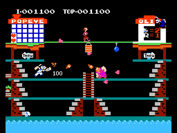 Im Spiel hat es Popeye natürlich mit seinem ewigen Widersacher Pluto - auch als Brutus bekannt - zu tun. Und wie auch aus den Cartoons bekannt, kämpfen die beiden um nichts anderes, als das Herz Olivias. Popeyes Herzblatt steht dabei ganz oben auf einer Plattform und wirft mit Herzchen, die er alle einsammeln muss, um seine Liebe zu beweisen. Doch so einfach wie das jetzt klingt, ist es leider auch nicht. Pluto macht Popeye dabei gehörig die Hölle heiß und jagt ihn quer durch den ganzen Level. Als ob das nicht genug wäre, wirft er zusätzlich mit Flaschen nach dem Seemann. Gar nicht so einfach, dabei auf die Herzchen zu achten, während sie langsam oben nach unten gleiten. Werden die Herzchen auf dem Boden liegen gelassen und nicht eingesammelt, findet Popeyes Abenteuer ein schnelles Ende und darf noch mal von vorne beginnen.