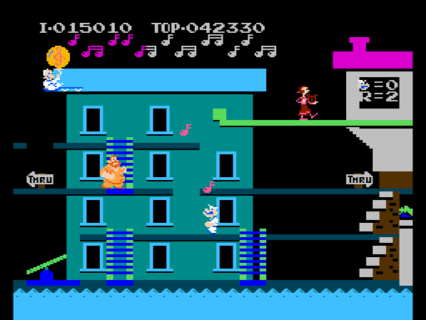 Dieser 3. Level ist dann auch schon der letzte des Spiels, wo wir auch schon beim größten Kritikpunkt angelangt sind: Der Umfang. Nur 3 Levels sind für ein Spiel ziemlich kurz, auch wenn es zwei Schwierigkeitsgrade gibt. Zumal kommt auch noch hinzu, dass sich alle sehr ähnelt und Abwechslung eigentlich nicht vorhanden ist. Die Steuerung ist prinzipiell gelungen, wirkt aber zuweilen etwas träge. Der Sound ist das für die damalige Zeit typische Gedudel. Popeye ist eben ein Spiel, das von seinem Charme lebt, denn für Nostalgiker ist es ein ideales Spiel, um in vergangenen Zeiten zu schwelgen. Auch wenn es spielerisch doch arg beschränkt ist, Spaß macht es dem geneigten Spieler trotzdem noch.
