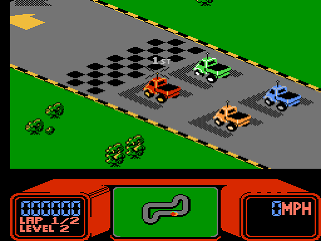 Wer jetzt denkt, dass er sich hier in einen teuren Schlitten setzt und mit anderen Rennwagen um die Wette flitzt, der täuscht sich. Wie es der Name vermuten lässt, gehen hier ferngesteuerte Autos an den Start (R.C. steht für Remote Control) und liefern sich in isometrischer Perspektive erbitterte Gefechte. Jeweils 4 Fahrzeuge bestreiten ein Rennen über eine je nach Kurs unterschiedliche Anzahl Runden. Wer unter die ersten 3 kommt, darf sich über die Qualifikation für das nächste Rennen sowie einen in der Zwischensequenz angezeigten Pokal freuen. Wer auf den letzten Platz fährt, für den hat der Rennspaß ein jähes Ende. Dank zwei Continues gibt es aber dennoch noch Hoffnung auf ein Weiterkommen.
