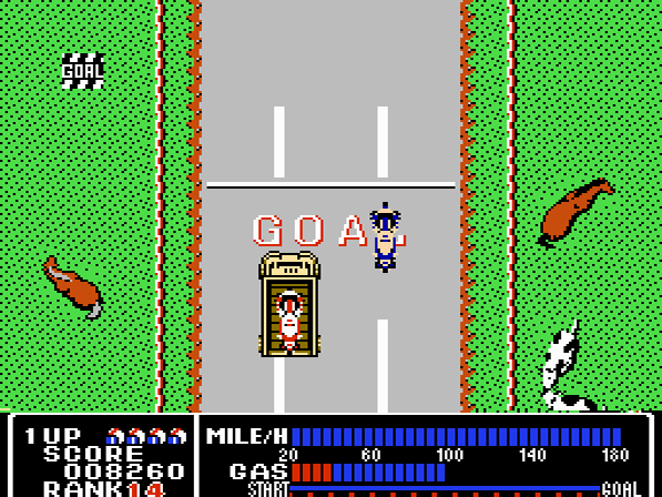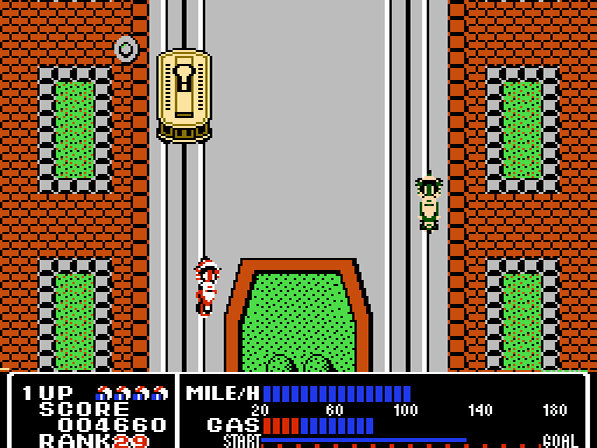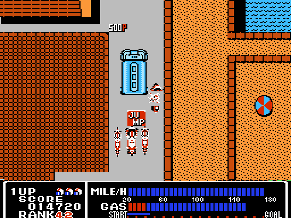 Glücklichwerweise verrät euch jeweils während der Rennen eine aufblinkende Zapfsäule, dass demnächst eine Tankmöglichkeit auf dem Weg liegt. Haltet ihr dort an, wird euer Benzinvorrat aufgefüllt, gleichzeitig verliert ihr aber auch Zeit und Ränge, die anschließend wieder aufgeholt werden müssen. Die gegnerischen Fahrer machen euch dies nicht immer einfach. Zwar sind diese meist nicht allzuschnell unterwegs, sorgen aber gerade deshalb auf den teils engen Streckenabschnitten häufig dafür, dass ihr nicht einfach vorbeiziehen könnt. Denn kollidiert ihr mit einem gegnerischen Motorradfahrer, ist das Rennen augenblicklich vorbei und ihr müsst die Strecke von vorne beginnen. Selbiges gilt auch beim Touchieren der Streckenbegrenzung und anderen auftauchenden Hindernissen wie Strassenbahnen oder plötzlich von Parpklätzen fahrenden Autos. Auch hier wird euch eines eurer 5 Leben bei einer Kollision abgezogen und das Rennen neu gestartet. Immerhin zerschellen aber auch gegnerische Fahrer an Hindernissen.