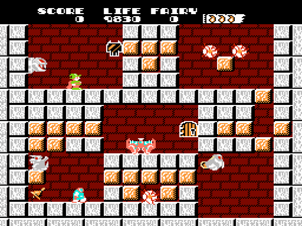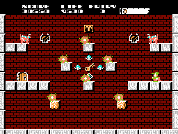 Bei den Items kann es sich beispielsweise um verschiedene Edelsteine und ähnliche Wertsachen handeln, welche euer Punktekonto aufstocken. Ebenso werdet ihr auf Glocken stoßen, die beim Einsammeln jeweils eine kleine Fee erscheinen lassen. Sammelt ihr insgesamt zehn der kleinen Wesen, so erhaltet ihr ein Extraleben. Weiterhin gibt es auch zwei unterschiedliche Amphoren zu finden. Das blaue Gefäß ermöglicht euch, einen kleinen Feuerball zu schiessen, welcher den Wänden entlang folgt und einen Gegner vernichtet, sobald er auf ihn trifft. Mit der orangefarbenen Amphore erhaltet ihr hingegen den großen Feuerball, welcher gleich mehrere Gegner treffen kann. Mit dem Aufsammeln einer Schriftrolle könnt ihr zudem die maximale Anzahl an gehorteten Feuerbällen erhöhen. Schafft ihr es, auch einen bestimmten Kristall zu finden, so verlängert sich die Reichweite des Feuerballs. Findet ihr gar Meltonas Medizin, so zerstört diese sämtliche Monster im aktuellen Raum. Weitere Items wirken sich auf die Lebensenergie aus. Zwar stirbt Dana bei einem Kontakt mit einem Gegner sofort, jedoch läuft nebenbei ein Zeitlimit in Form der Lebensanzeige. Diese könnt ihr mit Hilfe entsprechender Items wieder auffüllen bzw. erweitern. Es warten im Verlauf des Abenteuers zahlreiche weitere Gegenstände darauf, von Dana entdeckt zu werden.