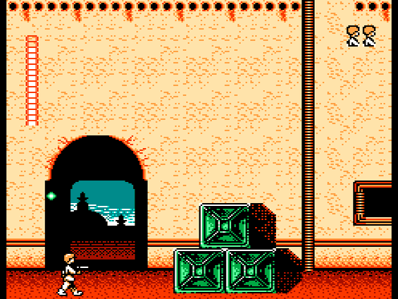 Trotz der spielerischen Beschränktheit, sprich mangelnde Fähigkeit, Lebenseinheiten für sich zu beanspruchen, verfügen Han und Leia gegenüber dem Farmerjungen Skywalker über wesentlich vorteilhaftere Argumente, wie einer höheren Schusskraft. Speziell die Dame mit der Kringelfrisur kredenzt ein weiteres explizites, die Waffe einer Frau nutzendes Attribut. Sowohl in dem Raupenschlepper der Jawas als auch während den metallisch gerüstartigen Levelkonstruktion der imperialen Superwaffe erfährt der Spieler innerhalb einiger Passagen eine Abnahme der Schwerkraft bzw. einen durch Luftsoge hervorgerufenen Schwebezustand. Hierbei wird der voluminöse Rock des Blaubluts - ähnlich Prinzessin Toadstool in Super Mario Bros. 2 - zum Fortbewegungsmittel, welches die Flugbahn um bedeutungsvolle Meter zu verlängern vermag. Denn allein Pixel entscheiden in Star Wars für das Nintendo Entertainment System zwischen Frust und Lust: Zwar sind die Plattformen deutlich erkennbar, dennoch liegen sie leicht unter den Größenverhältnissen eines durchschnittlichen Jump 'n' Runs. Dies ist speziell in den Grotten auf Tatooine oder innerhalb der Todessterntrakte ein zum hohen Schwierigkeitsgrad beitragender Faktor.