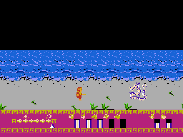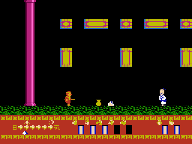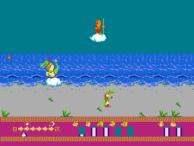 Bei eurer Odyssee durch das alte China verändert sich übrigens alle paar Minuten die Bildschirmfarbe. Der Entwickler VAP programmierte für Super Monkey Daibouken tatsächlich einen Tag-Nacht-Wechsel, wobei euch die Fortschrittsleiste unten links die jeweilige Tageszeit anzeigt. Für ein Spiel von 1986 ist dies schon recht erstaunlich. Die Tageszeit erfährt allerdings nur an sehr wenigen Stellen des Spiels eine spielerische Bedeutung. So kommt ihr beispielsweise etwa in der Mitte des Spiels nur bei Nacht durch ein verschlossenes Tor hindurch.