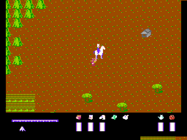 So irrt ihr also eine gefühlte Ewigkeit auf der Oberwelt herum - immer in der Hoffnung, irgendetwas zu finden. Wer nicht aufgibt (oder einschläft), gelangt schließlich zu einem der im Spiel verteilten Häuser oder zu weiteren Warps, die euch im Spiel voranbringen. Die Hausbewohner versorgen euch mit neuem Reiseproviant, der euch vor dem Game Over bewahrt, da sich die Vorräte während des Spielens ganz langsam verringern und nicht leer werden dürfen. Achtet auf die Anzeigen unten rechts. An bestimmten Stellen des Spiels habt ihr zudem die Chance, zwei weitere Wegbegleiter für euch zu gewinnen. Dazu müsst ihr mit ihnen gemeinsam einen weiteren der oben beschriebenen Kämpfe absolvieren. Anschließend gesellt sich der neue Charakter zu eurer Partie dazu und unterstützt euch fortan bei Gegnerkonfrontationen, indem er im Kampf-Bildschirm herumläuft und gelegentlich mal einen Treffer landet.