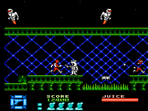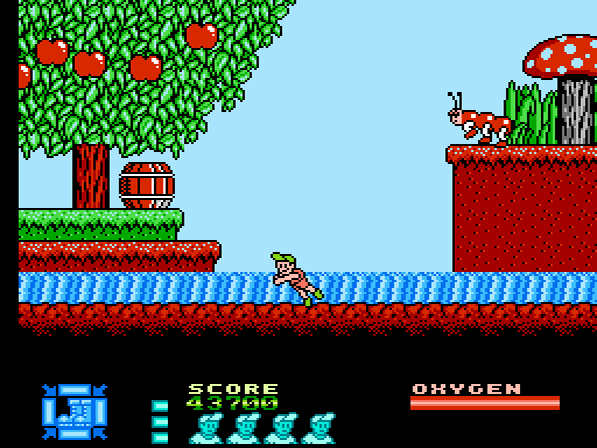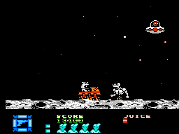 Neben dichten Wäldern und einem verzwickten Maschinen-Level führt euch die Schatzsuche gar in das Innere des NES und auf den Mond (inklusive Weltraumanzug mit Hasenohren). Dabei kriegt ihr es auch immer wieder mit angriffslustigen Kreaturen zu tun, die sich je nach Umgebung in Form von hartnäckigen Tausendfüßlern, düsteren Clowns bis hin zu ballerwütigen Robotern präsentieren und an eurer Energieleiste zehren wollen. Ganz wehrlos ist Skooter den Fieslingen gegenüber jedoch nicht. Durch entsprechende Items kann er sich durch Tritte oder auch via Schusswaffe mit begrenzter Munition Respekt verschaffen. Ebenso hilfreich sind verschiedene Fortbewegungsmittel wie das angesprochene U-Boot, welche euch nicht nur das Weiterkommen ermöglichen, sondern auch den Kampf gegen die Plagegeister erleichtern. Um das nicht immer ganz einfache Abenteuer etwas erträglicher zu machen, lassen sich zudem immer wieder Extraleben finden. Positiv zu erwähnen sind die Checkpoints. Nach dem Ableben macht ihr stets an derselben Stelle weiter.