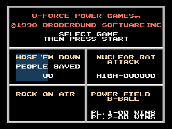 U-Force Power Games besteht aus insgesamt 4 Spielen, welche via Select Knopf in einem Menü ausgewählt werden können. Auch bereits erreichte Highscores werden euch hier angezeigt. Mittels Start-Button beginnt ihr das jeweils ausgewählte Spiel, wobei euch auch gleich die individuell benötigte Einstellung der „Game Switches“ am U-Force angezeigt wird.