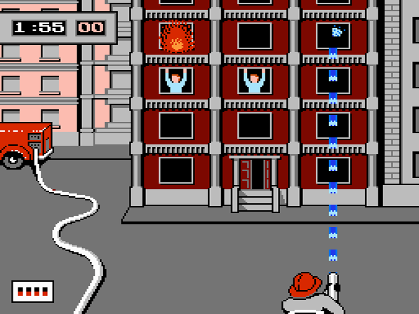 Als erstes Spiel findet sich Hose ‘em down in der Sammlung, für welches man den U-Force-Controller flach vor sich hinlegt. Ihr übernehmt die Kontrolle über einen Feuerwehrmann, welcher 2 Minuten lang Personen aus einem brennenden Gebäude retten soll. Diese melden sich mit einem kurzen „HELP!“ , bevor sie am Fenster erscheinen. Mit dem Wasserstrahl aus dem Feuerwehrschlauch gilt es nun, die Personen zu erfassen und sachte auf den Boden zu transportieren. Geht ihr dabei zu hastig vor, fällt euch das Opfer unsanft zu Boden, was als fehlgeschlagene Rettung gewertet wird. Zu langes Zögern endet hingegen damit, dass die Hilfebedürftigen in Flammen aufgehen. Mit der linken Hand und dem Sensor links-außen steuert ihr den Feuerwehrmann hin und her, mit der rechten Hand navigiert ihr die Höhe des Wasserstrahls durch sanfte Auf- und Abbewegungen mit der Hand. Gelegentlich platzen beim Wasserschlauch Löcher auf, was den Wasserdruck und damit verbunden auch die erreichbare Höhe mindert. Diese stopft ihr durch schnelles Wischen über die mittleren Sensoren mit beiden Händen. Hose ‘em down nutzt die feinfühlige Steuerung des U-Force-Controllers bei der stufenfreien Navigierung des Wassers und des Feuerwehrmannes gut aus und macht nach Übung und Eingewöhnung auch durchaus Spaß.