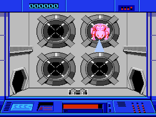 Das nächste Spiel im Bunde ist Nuclear Rat Attack. Hier wird das U-Force analog zu Punch-Out!! im Winkel von 110° mit Power Bar aufgestellt. Aus vier verschiedenen Tunneln kriechen euch Ratten entgegen, die ihr mit Boxbewegungen gegen die vier gleich angeordneten Sensoren in die Rohre zurückdrängt und vertreibt. Schlagt ihr in Richtung eines leeren Tunnels, so gibt es dafür drastischen Punktabzug. Mit der Zeit werden die Ratten immer zahlreicher und schneller. Für jeden entwischten Nager wächst eine rote Leiste unten im Bild ein Stück weiter. Ist diese komplett gefüllt, heißt es Game Over. Die Steuerung funktioniert hier einwandfrei und lässt euch das Ungeziefer präzise wegboxen, allerdings hält sich aufgrund des simplen Spielprinzips der Spaß doch eher in Grenzen.