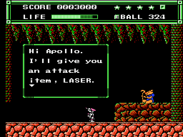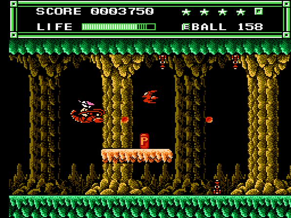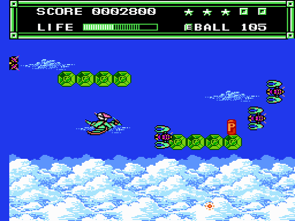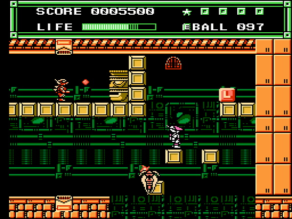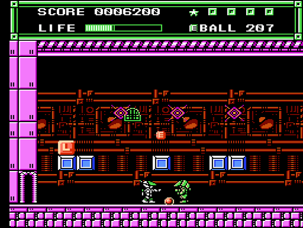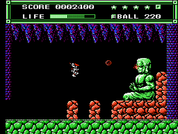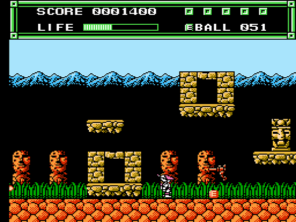 Ordentlich Gegner zu besiegen macht auf eurer Mission durchaus Sinn, denn für jeweils 50.000 erzielte Punkte werdet ihr mit einem zusätzlichen Leben belohnt. Wie bereits angesprochen habt ihr die Möglichkeit, auf verschiedene Waffen zurückzugreifen. Neben dem Standard-Handbeam, welcher einen kurzen, geraden Strahl ausgibt, trefft ihr auch früh auf den 45B-Ball, welcher im 45°-Winkel von Objekten abprallt. Auch Laser oder der Wände durchdringende Wave-Ball gehören zum Arsenal. Auf Seiten der magischen Items gibt es unter anderem die Foot Wings, welche euch kurzzeitig durch die Lüfte schweben lassen. Der Spiegel lässt einen Doppelgänger auf eurem Kopf erscheinen, der eure Aktionen (Sprünge und Angriffe) kopiert. Und der Typhoon macht euch für 9 Sekunden unverwundbar.