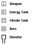 Willkommen zur Metroid Komplettlösung! Diesen Guide zu schreiben, war wirklich schwer, aber ich hoffe, dass er für alle verzweifelten Spieler unter euch nützlich sein wird. Die Texte beziehen sich jeweils auf Karten, die in den entsprechenden Abschnitten ebenfalls in dieser Komplettlösung zu sehen sind. Die erste Zahl bezieht sich dann auf die vertikale Koordinate, die zweite auf die horizontale. Die Legende der Karten seht ihr rechts neben diesem Text.
