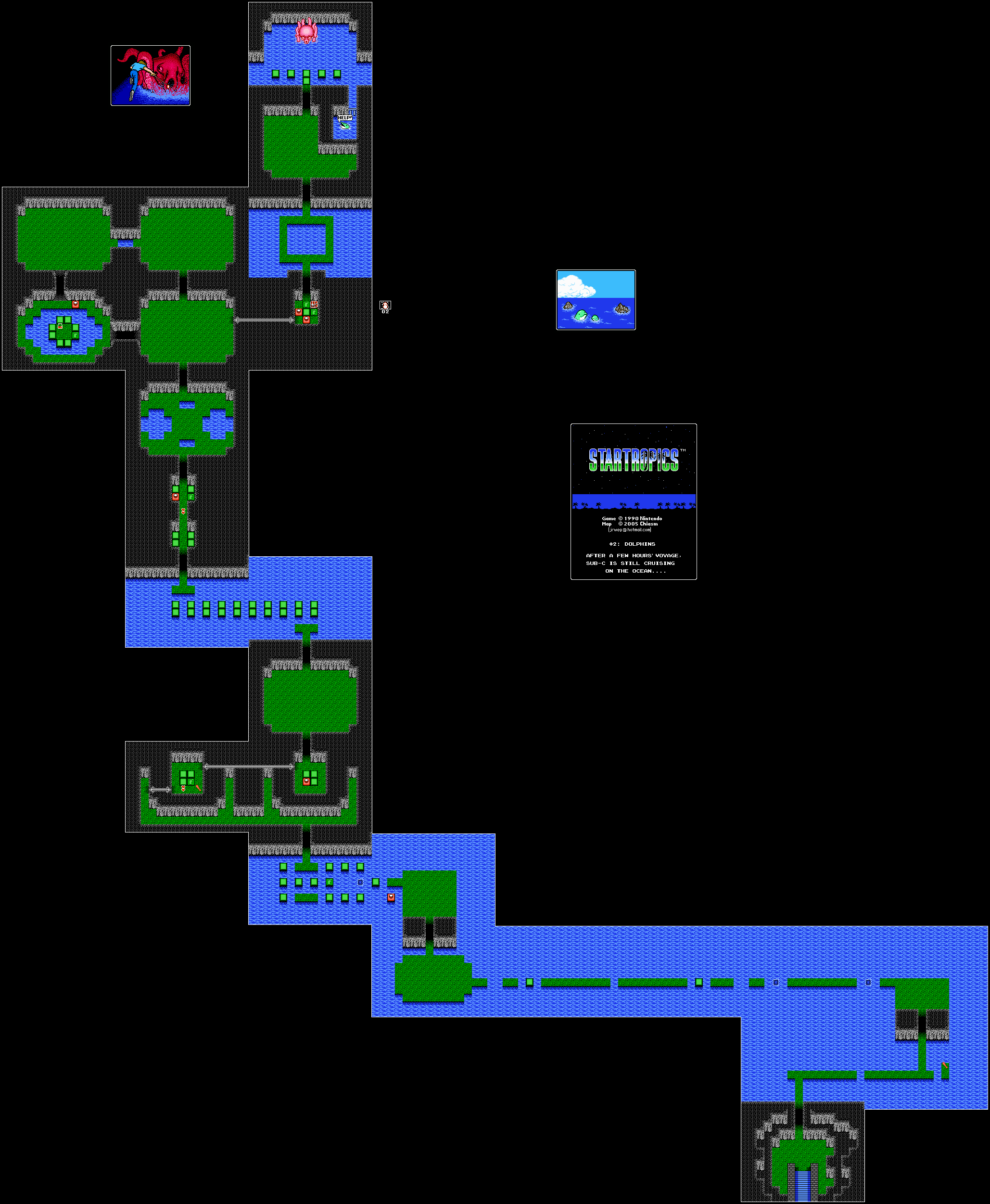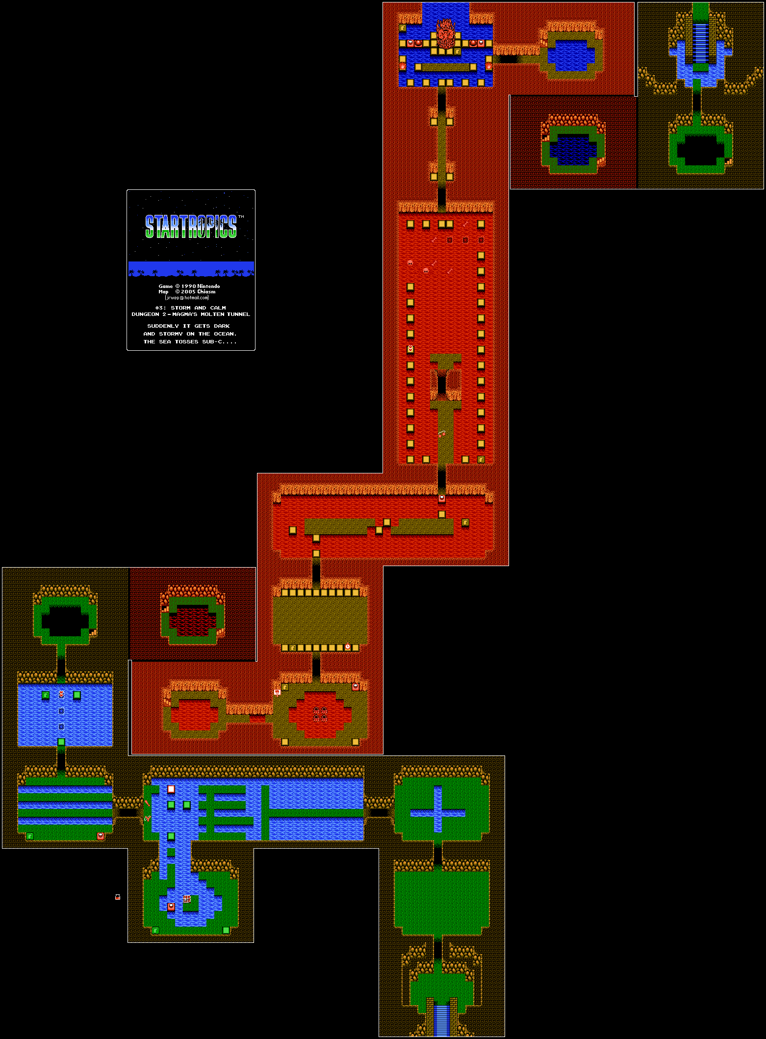 Fahrt nach rechts zur grossen Insel, wo ihr etwas weiter unten eine Stelle findet, wo ihr auf die andere Seite durchtauchen könnt. Etwas rechts vom Auftauchpunkt könnt ihr dem Dorf Howduyadu-cola einen Besuch abstatten, notwendig ist dies jedoch nicht. Ansonsten geht ganz nach oben links bis ihr ganz in der Ecke eine Tauchstelle findet. Ihr gelangt von dort in die in der Mitte liegenden tieferen Gewässer. Von hier aus könnt ihr nach unten tauchen, wo ihr einen (nutzlosen) Apfel findet. Der normale Weg führt jedoch weiter nach rechts via einer weiteren Tauchstation. Begebt euch nach dem Auftauchen auf die unter euch liegende Insel, wo ihr einen weiteren Herzcontainer findet. Etwas weiter rechts könnt ihr auf der oberen Insel Rob Crusocola (oder dem, was von ihm übrig ist) einen Besuch abstatten. Ganz unten rechts könnt ihr unter der länglichen Insel durchschwimmen.