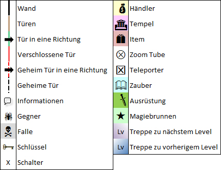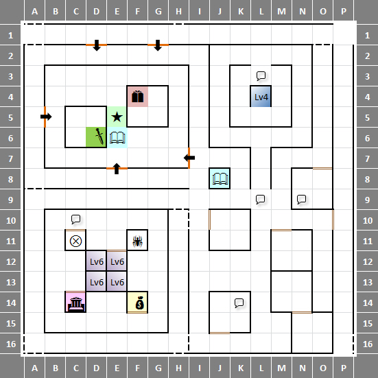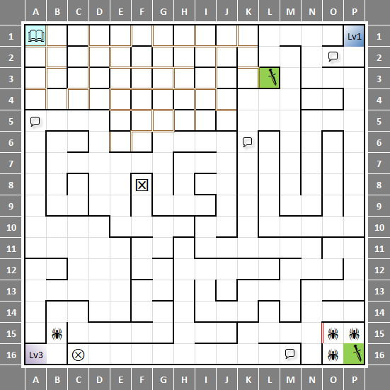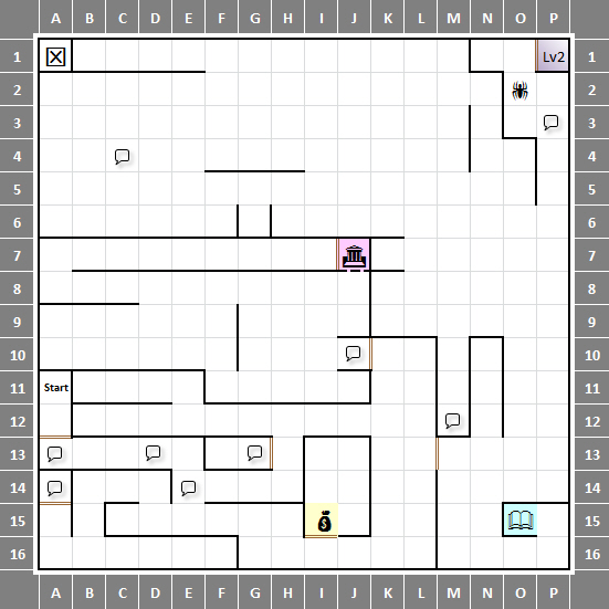 Ihr startet im Feld A11. Begebt euch als erstes zum Tempel (J7), wo ihr euch jederzeit erholen könnt. Nutzt die Möglichkeit des verstecken Durchgangs von J8 her. Am besten bestreitet ihr hier erst einmal einige Kämpfe und sammelt Geld und Erfahrungspunkte. Besucht danach den Händler bei I5 und rüstet euch bestmöglich aus. Holt euch danach den Zauber Sting bei O15. Danach marschiert ihr Richtung P1, wo sich die Treppe zum zweiten Level befindet. Idealerweise solltet ihr eure Party bereits auf Level 3 trainiert haben, da bei O2 eine ganze Gruppe von Gegnern auf euch wartet. Habt ihr diese Bezwungen, so geht’s hinunter ins nächste Stockwerk.
