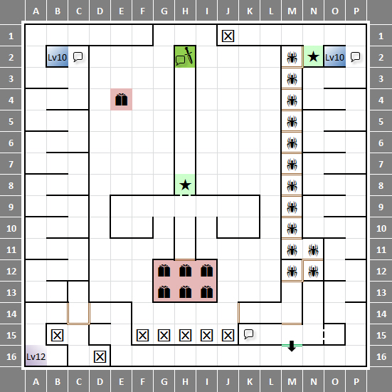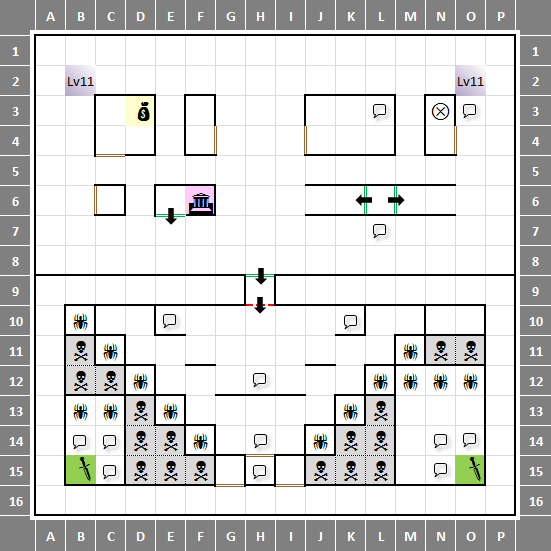 Habt ihr die Zoom Tube in Level 9 genutzt, so startet ihr bei H15. Nutzt Passwall und Flight um an Feuer-Schild und –Schwert bei B15 und O15 zu kommen. Um weiter nach Norden zu gelangen, aktiviert die Schalter wie folgt: E10, K10, K10, E10. Bei korrekter Ausführung werdet ihr nach H8 teleportiert. Hier dürft ihr euch im Tempel auffrischen und beim Händler ausrüstungstechnisch auf den aktuellsten Stand bringen. Nehmt danach die Treppe hinunter zum nächsten Stockwerk.