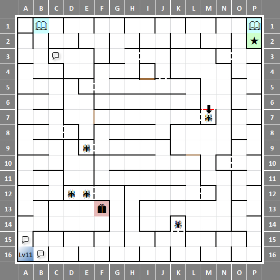 Unabhängig welche Treppe ihr genommen hab, geht erst einmal via Passwall durch die Wand bei F1/J1 in den zentralen Raum. Nutzt nochmals Passwall um zur Spitze des schwertförmigen Raumes zu gelangen. Dreht euch hier sieben mal nach links und/oder rechts, um das Ruby Sword zu erhalten. Dadurch wird auch die Schatzkammer im unteren Teil des Schwertraumes freigelegt. Nehmt danach bei E16 die Treppe zum 12. Level.
