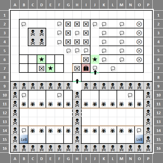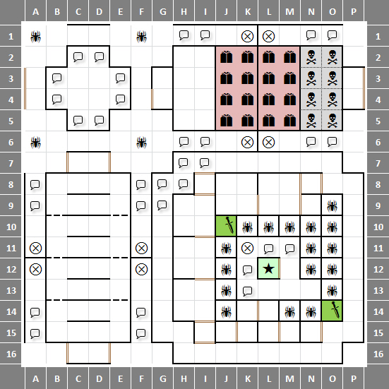 Ab hier wird es knifflig! Um an das Ruby Amulett zu gelangen, müsst ihr mindestens sechs Gruppen mit jeweils 7 Gegnern besiegen. Geht also sparsam mit euren Magiepunkten um. Die einzige Möglichkeit aus diesem Bereich des Levels zu entkommen ist ein Passwall von G8 nach F8, allerdings ist dieser nur in die eine Richtung möglich.