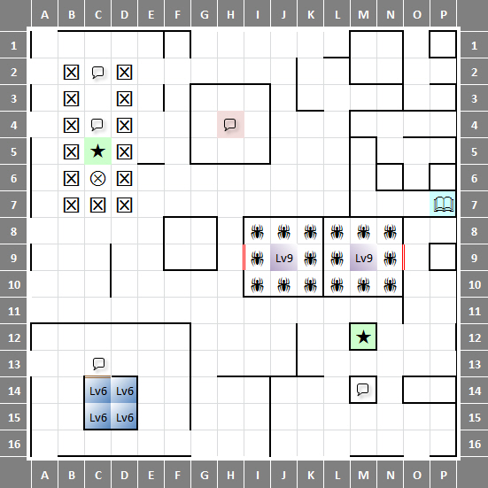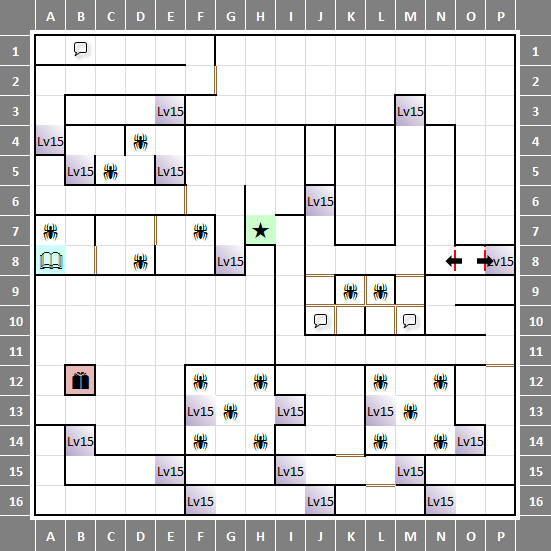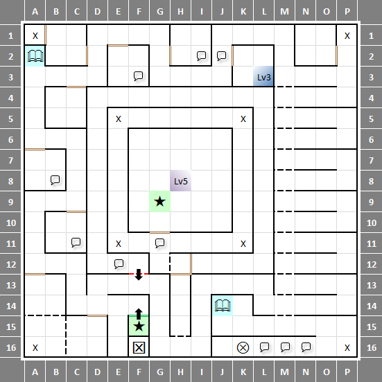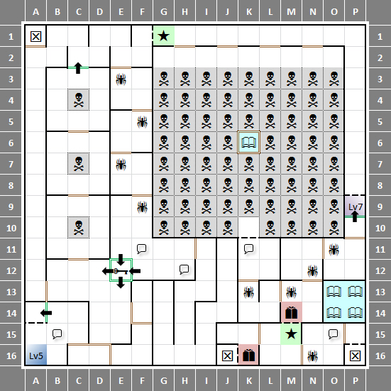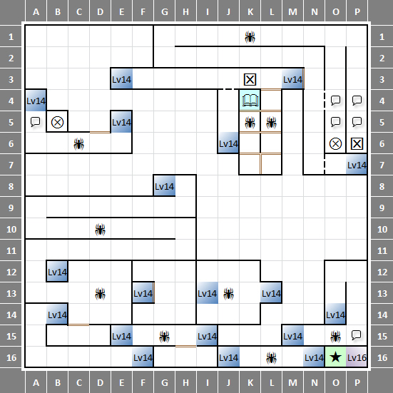 Von M3 aus geht in den Raum bei L4 und nutzt Passwall nach Westen. Hier findet ihr den letzten Zauber, Crystallize. Nutzt dann wieder Passwall um zu M4 zu gelangen und lauft danach nach Süden bis zur nächsten Wand. Passwallt euch durch die beiden nächsten Wände und geht nach Osten. Nutzt die Treppe dort nicht, sondern heilt eure Party und via Passwall nach rechts kommt ihr zum Magiebrunnen. Bei P16 nehmt ihr die Treppe zum letzten Level.