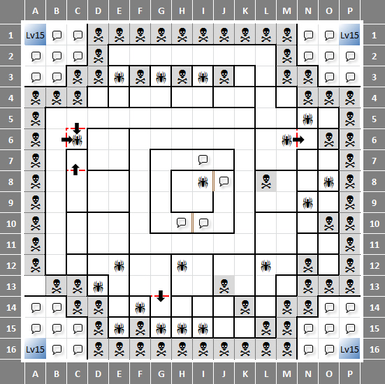 Je nachdem welche Treppe ihr genommen habt, landet ihr entweder bei B15 oder bei O15. Begebt euch in den mittleren Teil des Levels, nutzt aber vorher den Flight-Zauber um den Fallen zu entgehen. Geht nach Norden in den kleinen Raum und nutzt Passwall nochmals Richtung Norden. Nutzt danach nochmals Passwall um durch die von Warnungen umzäunten Wände zu kommen. Der Mann dort schenkt euch einmalig 1‘000 Erfahrungspunkte. Doch hütet euch vor weiteren Besuchen, dann wird er euch jedes Mal 1‘000 Punkte abziehen. Nutzt danach den Teleporter bei J7 um zum Zoom Tube-Level zu gelangen. Lauft rückwärts in die Zoom Tube bei O3 und ihr landet im Südlichen Teil von Level 10.