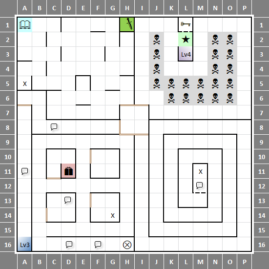Level 3 startet ihr bei A16. Begebt euch zu den Raum mit den Türen, die bis auf eine alle verschlossen sind. Wie der Hinweis bei C8 schon verrät, müssen diese mit Schaltern geöffnet werden. Nehmt die Tür unten links nach H9. Nehmt dort auf jeden Fall den Horseshoe (D11) mit und betätigt den Schalter bei G14. Müsst ihr zurück in Welt 1, dann nehmt am besten die Zoom Tube bei H16. Ansonsten geht es weiter durch die entsperrte Tür nach H6, holt euch den Zauber oben links und entriegelt die nächste Tür via Schalter bei A5. Begebt euch danach zu M11 um auch die letzte Tür dieses Levels zu entsperren. Nehmt die Tür nach M6 und vermeidet die Fallen, indem ihr der Wand entlang lauft. Bei L1 schnappt ihr euch den Gold Key, mit welchem ihr in Level 2 die Tür von N15 zu O15 aufsperren und die Ruby Glasses einsammeln könnt. Bei L3 gelangt ihr ins nächste Level.