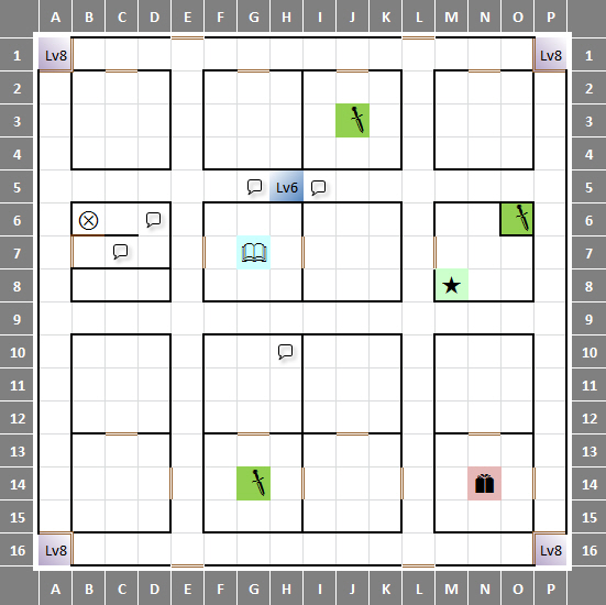 Ihr startet das Level bei C14 und werdet schnell feststellen, dass der grösste Teil der Wände in Level 8 unsichtbar sind. Orientiert euch anhand der Karte, zählt eure Schritte und begebt euch erst einmal zu H4. Nutzt hier den in Level 3 gefundenen Horseshoe und ihr erhaltet 5'000 Erfahrungspunkte. Achtet darauf, dass ihr die Punkte nicht verschwendet, denn bei einem Level-Up gehen überzählige Punkte verloren. Bei P7 könnt ihr euch den Major Heal holen, sofern ihr ihn in Level 7 verpasst habt. Nutzt den Brass Key aus Level 6 bei den verschlossenen Türen bei J9 und O9 um zur Treppe zu Level 9 zu gelangen.